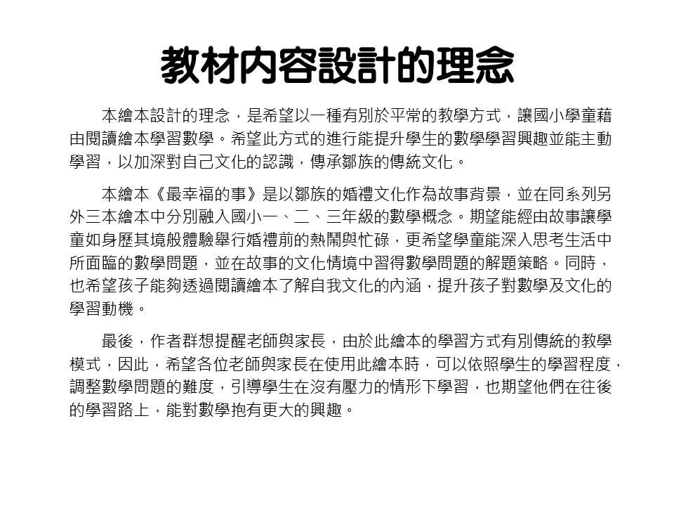 本繪本《最幸福的事》是以鄒族的婚禮文化作為故事背景,並在同系列另外三本繪本中分別融入國小一、二、三年級的數學概念。期望能經由故事讓學童如身歷其境般體驗舉行婚禮前的熱鬧與忙碌,更希望學童能深入思考生活中所面臨的數學問題,並在故事的文化情境中習得數學問題的解題策略。同時,也希望孩子能夠透過閱讀繪本了解自我文化的內涵,提升孩子對數學及文化的學習動機。