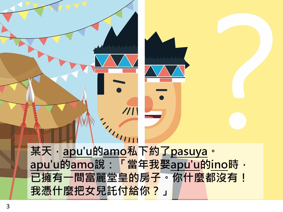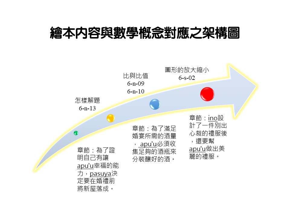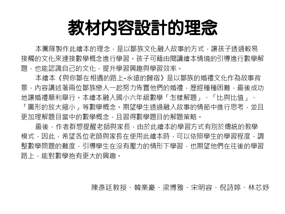 本繪本《與你鄒在相遇的路上-永遠的歸宿》是以鄒族的婚禮文化作為故事背景,內容講述著兩位鄒族戀人一起努力佈置他們的婚禮,歷經種種困難,最後成功地讓婚禮順利舉行。本繪本融入國小六年級數學「怎樣解題」、「比與比值」、「圖形的放大縮小」等數學概念。期望學生透過融入故事的情節中進行思考,並且更加理解題目當中的數學概念,且習得數學題目的解題策略。