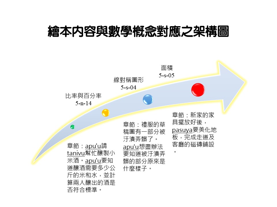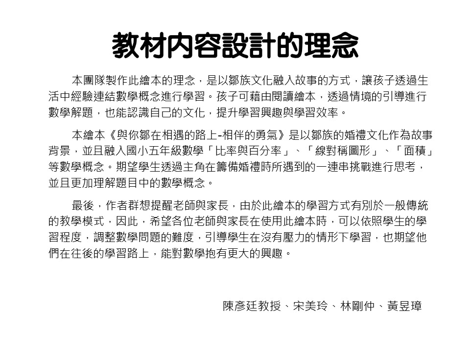 本繪本《與你鄒在相遇的路上-相伴的勇氣》是以鄒族的婚禮文化作為故事背景,並且融入國小五年級數學「比率與百分率」、「線對稱圖形」、「面積」等數學概念。期望學生透過主角在籌備婚禮時所遇到的一連串挑戰進行思考,並且更加理解題目中的數學概念。